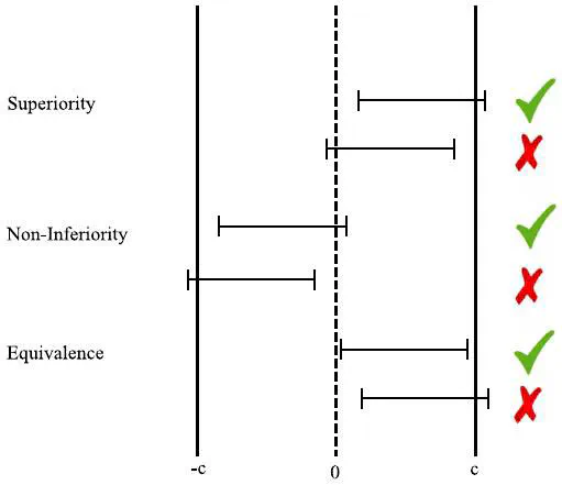In clinical trials, study designs may focus on assessment of superiority, equivalence, or non-inferiority, of a new medicine or treatment as compared to a control. Typically, evidence in each of these paradigms is quantified with a variant of the null hypothesis significance test. A null hypothesis is assumed (null effect, inferior by a specific amount, inferior by a specific amount and superior by a specific amount, for superiority, non-inferiority, and equivalence respectively), after which the probabilities of obtaining data more extreme than those observed under these null hypotheses are quantified by p-values. Although ubiquitous in clinical testing, the null hypothesis significance test can lead to a number of difficulties in interpretation of the results of the statistical evidence. We advocate quantifying evidence instead by means of Bayes factors and highlight how these can be calculated for different types of research design. We illustrate Bayes factors in practice with reanalyses of data from existing published studies. Bayes factors for superiority, non-inferiority, and equivalence designs allow for explicit quantification of evidence in favor of the null hypothesis. They also allow for interim testing without the need to employ explicit corrections for multiple testing.